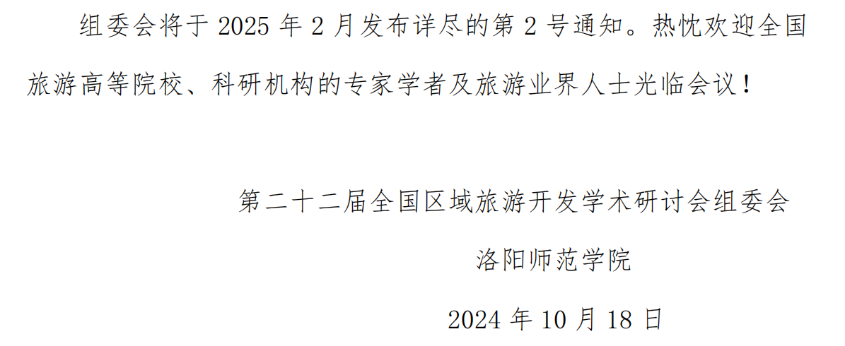 在此背景下,中国区域科学协会区域旅游开发专业委员会将于2025年5月9-11日在河南洛阳举办“旅游强国建设专题研讨会暨第二十二届全国区域旅游开发学术研讨会”,围绕新时代旅游强国建设和区域旅游高质量发展的新形势、新任务、新机遇等开展学术交流。诚挚邀请全国区域旅游开发研究与实践领域的专家学者齐聚洛阳,分享成果,交流经验,共同研讨区域旅游开发的新未来。兹将有关事项通知如下: