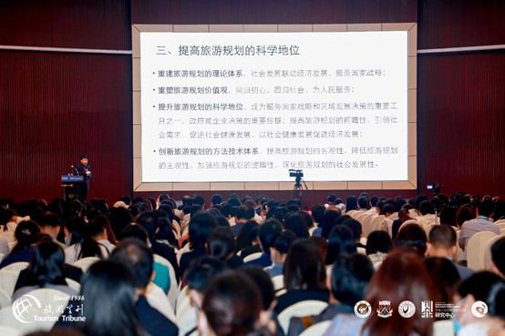 再一个问题是要提高我们的科学地位。我们要有发言权,核心是要有自己的语言体系、技术体系,所以要重视旅游规划的理论体系。社会发展联动经济发展要服务于国家战略,服务于地方战略,而不是一个产业;我们要放眼更大的时空来看这个问题。价值观的问题,跟我们每个人相关。你作为这个专业,你的基本观念是什么,不同的专业有不同的追求,有不同的视角,我们做旅游规划的价值观是什么?回归初心、回归社会,为人民服务是我们旅游人的价值观。我们的规划是为人民的,为大众的,我觉得这个立场要站稳,我们的规划思路和方法都不一样,我们看到一个地方的优势也不一样。旅游规划应该成为国家战略,区域发展的一种重要工具,它应该是政府、企业决策的重要依据。我们要做的是要提高它的前瞻性,不能就事论事,我们要在更大的时空下来做这件事情。要创新方法技术,就要有核心的东西,现在我们的核心东西不过硬,所以要提高客观性,降低主观性,加强逻辑性,深化社会发展性。我们做的应该是为社会健康发展服务,而不是以经济发展为核心目标,这两个关系是不一样的。