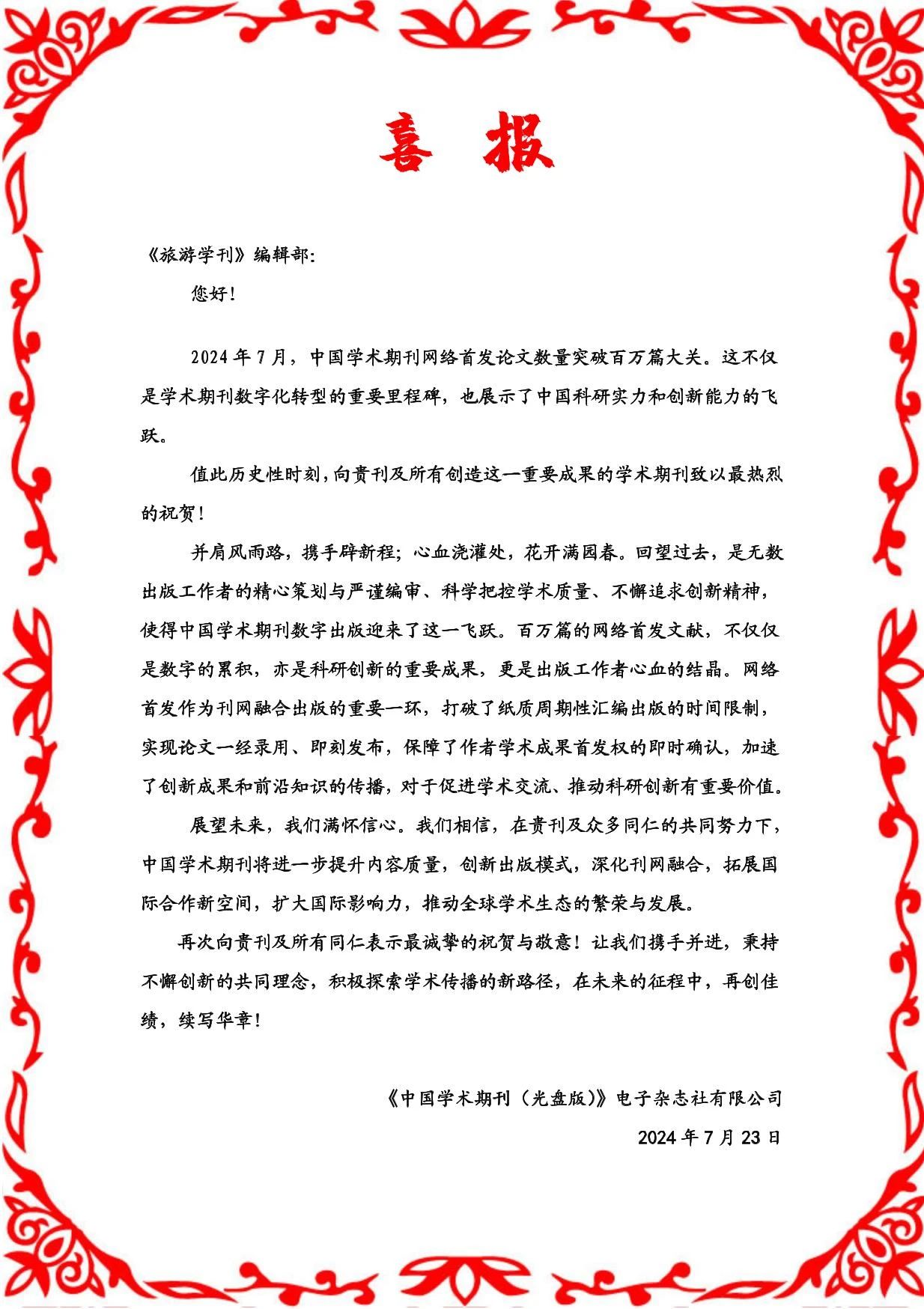 2024年7月23日16:30,中国学术期刊网络首发论文正式突破100万篇。中国知网打造“网络首发”平台,支持学术期刊录用定稿的网络发布,实现了单篇自主上传、即定即发的高效流程。截至2024年7月,已有3200余种学术期刊加入中国知网网络首发平台,网络首发论文平均提前纸质出版时间114.6天。