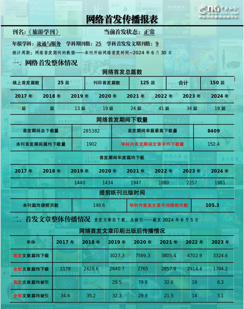 中国知网数据显示,北京联合大学《旅游学刊》编辑部自2019年开始上传网络首发文章,截止到2024年6月30日,共网络首发150篇文章,总下载量为285 382,学科内网络首发期间文章平均下载量为152.4。