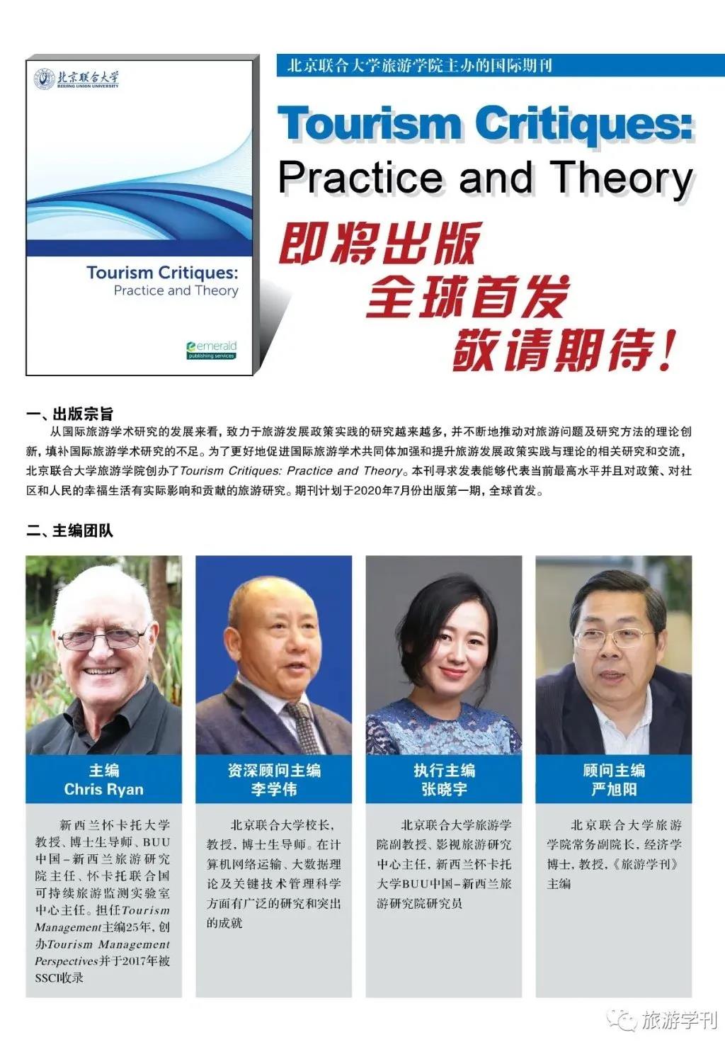 从国际旅游学术研究的发展来看,致力于旅游发展政策实践的研究越来越多,并不断地推动对旅游问题及研究方法的理论创新,填补国际旅游学术研究的不足。为了更好地促进国际旅游学术共同体加强和提升旅游发展政策实践与理论的相关研究和交流,北京联合大学旅游学院创办了Tourism Critiques: Practice and Theory。该刊寻求发表能够代表当前最高水平并且对政策、对社区和人民的幸福生活有实际影响和贡献的旅游研究。期刊计划于2020年7月份出版第一期,全球首发。