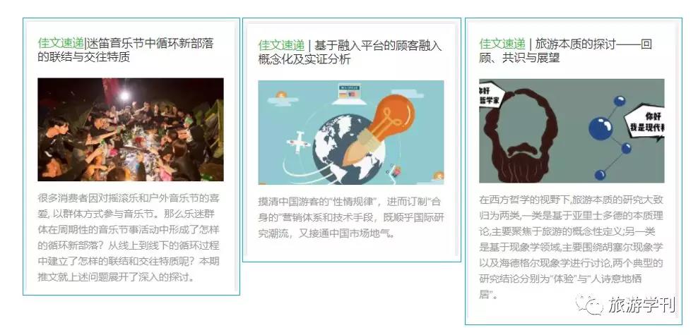 “佳文速递”栏目的文章由在《旅游学刊》发表论文的作者撰写,再由志愿者撰写编者按进行推荐。本栏目的文章关注论文背后的故事,挖掘作者的研究心得,配合作者照片和案例地图片,是纸质期刊发表论文的线上拓展。同时,文章在推送时还会提供该篇发表文章的原文链接,引导感兴趣的读者进一步阅读全文。